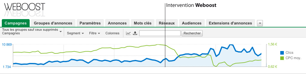 Sur la base du coût d'acquisition et du contrôle de la conversion, weboost effectue la création des campagnes complémentaires et règle les budgets sur l'équation "coût d'acquisition/conversion" la plus favorable.